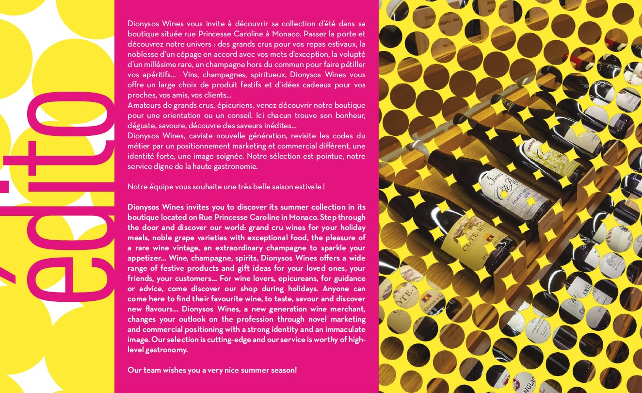 L’agence Colibri a réalisé la nouvelle brochure de la collection estivale de son client, le caviste Dionysos. Design épuré, chic et moderne, les grands crus, les champagnes et spiritueux de prestige sont mis en valeur dans cette nouvelle brochure. Le code couleur joue sur deux teintes, l’argent et le bleu turquoise, en référence à la Méditerranée, il se décline en impression mais aussi en frappe à chaud sur la 1ère de couverture de la brochure et sur les enveloppes. L'agence a conçu le projet dans sa globalité, de la création au suivi de fabrication, choix des papiers.