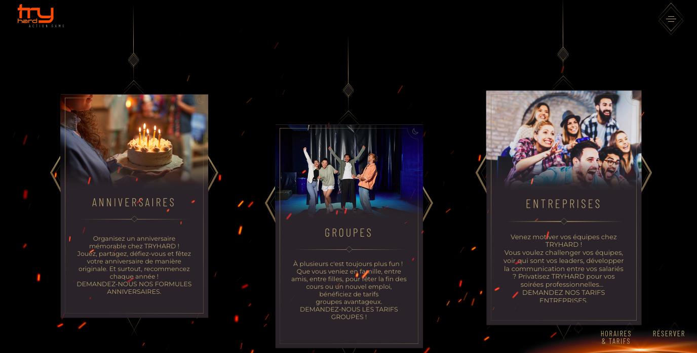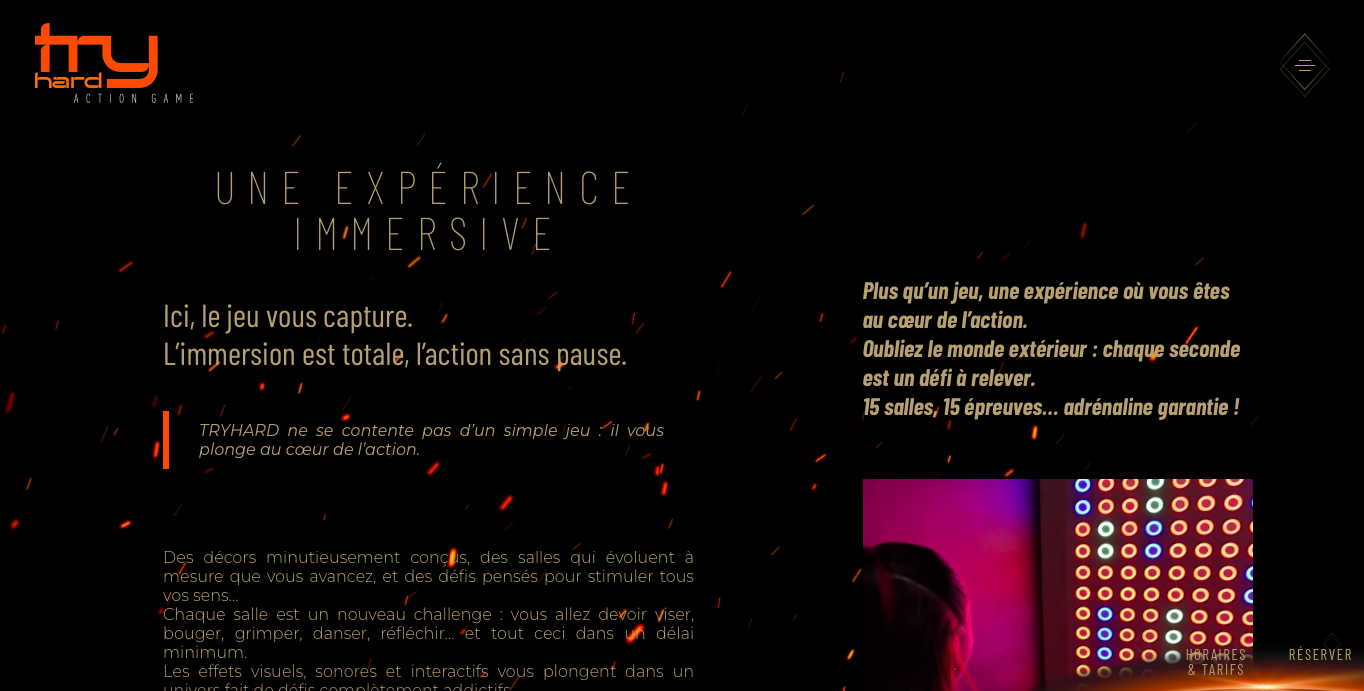 Nous avons eu le plaisir de concevoir et développer le site de TRY HARD, le nouvel espace d’action?game à Antibes où le jeu devient un défi physique et collectif. Le site a été pensé pour refléter l’énergie, l’esprit de compétition et le fun intense qui caractérisent l’expérience TRY HARD, tout en guidant clairement les visiteurs vers l’information essentielle et les réservations.